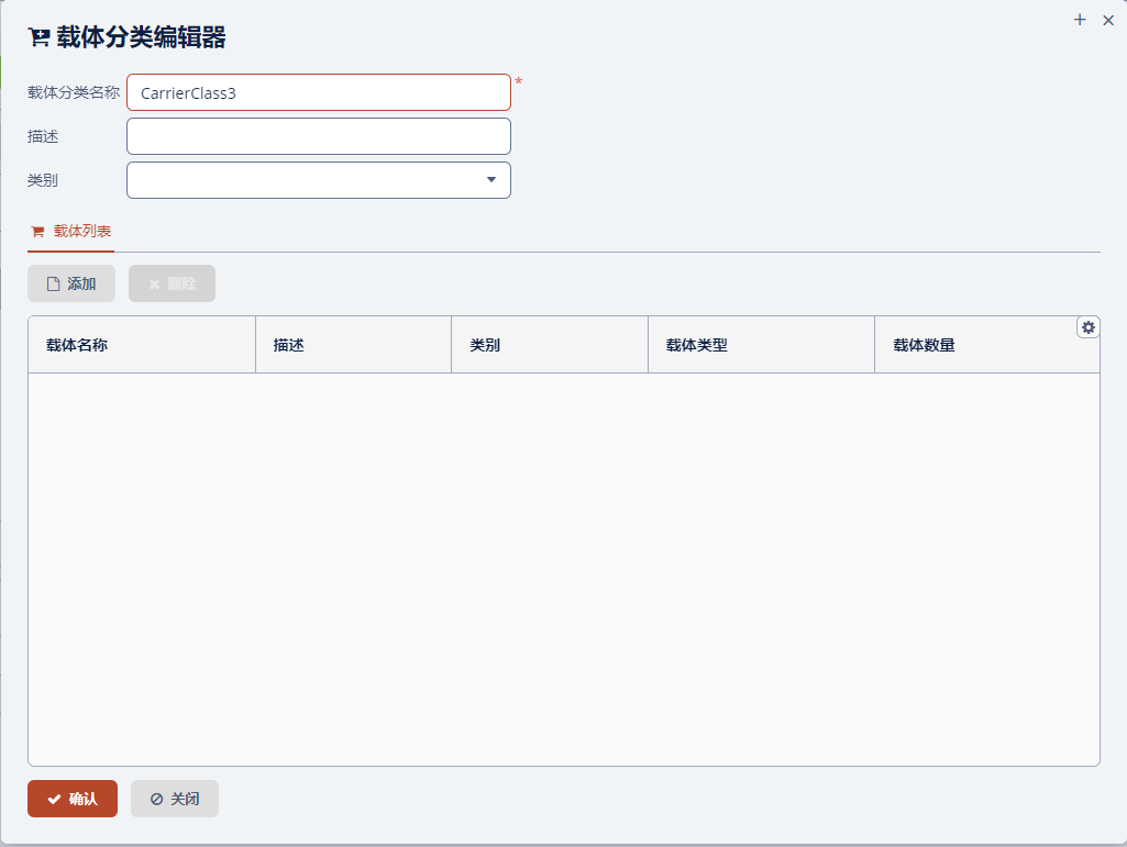 载体分类维护 功能说明:该功能用户维护载体分类主数据。 基础主数据:需要先维护载体主数据。 查询 直接点击【查询】按钮,查询所有载体分类主数据。 输入查询条件,点击【查询】按钮,查询结果为根据条件过滤后的载体分类主数据。 创建 载体分类名称:必填,不可重复,字母区分大小写。 描述:非必填。 类别:非必填,在实体类别维护页面中维护,维护后可选择。 点击【确认】按钮,数据将被保存到数据库,并关闭弹窗。 点击【关闭】按钮,数据不会保存到数据库,并关闭弹窗。 编辑 载体分类名称:必填,不可重复,字母区分大小写。 描述:非必填。 类别:非必填,在实体类别维护页面中维护,维护后可选择。 点击【确认】按钮,数据将被保存到数据库,并关闭弹窗。 点击【关闭】按钮,数据不会保存到数据库,并关闭弹窗。 删除 点击【是】按钮,数据将从数据库中删除,并关闭弹窗。 点击【否】按钮,数据不会从数据库中删除,并关闭弹窗。 载体维护 位置维护